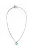 hangs from a delicate chain, catching light to reveal flashes of green, blue, and