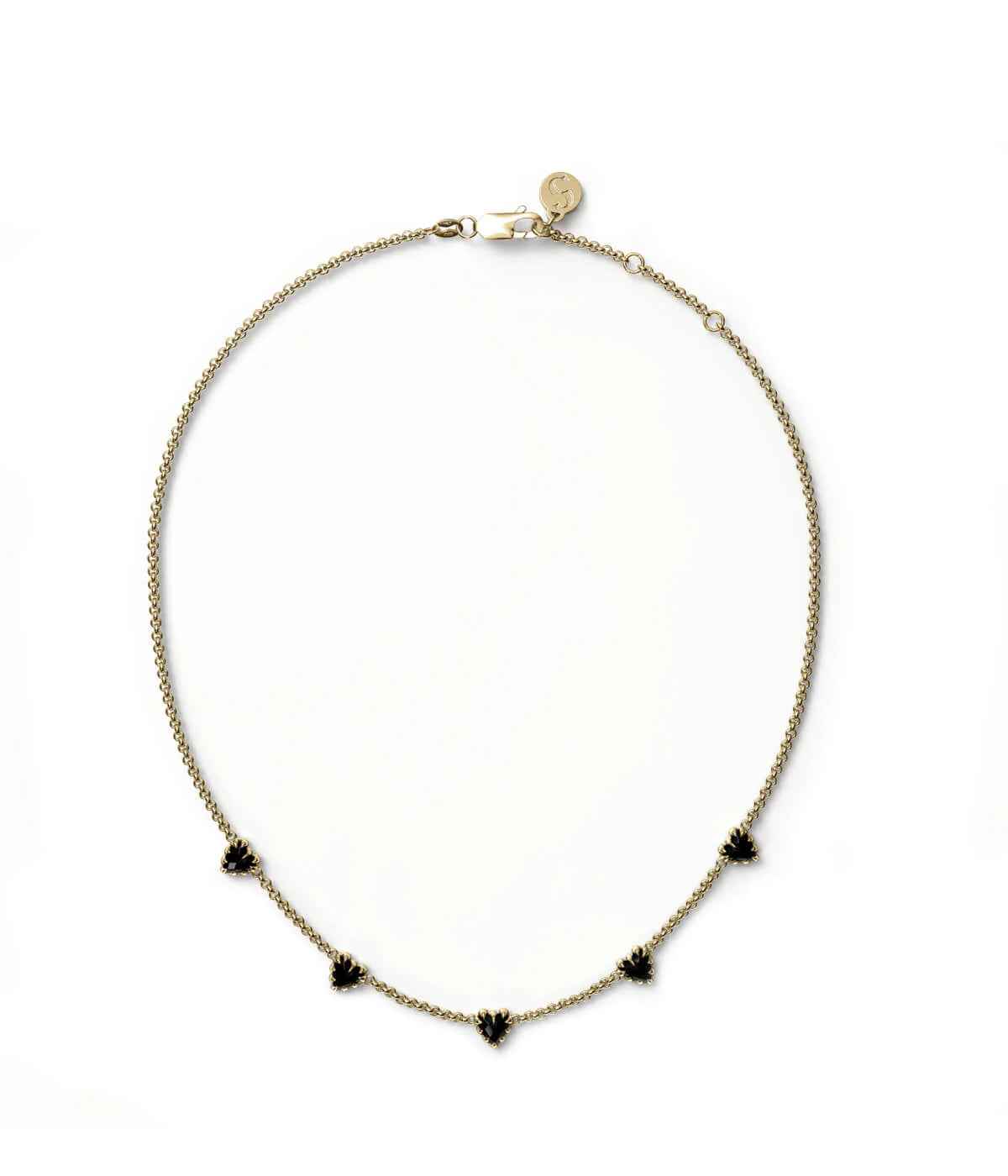 A reimagined classic. This collar-length necklace is composed of heart-cut black onyx stones, each framed in our signature claw settings and linked to form a seamless strand. Set in sterling silver and plating in 18k yellow gold it pairs effortlessly with tailoring or minimal evening wear - a more structured take on the traditional tennis necklace.