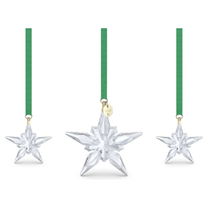 This magical holiday set continues the iconic tradition of Swarovski's Annual Edition Ornaments. The set features three clear stars, crafted with a total of 570 facets, that are inspired by the serenity of the night sky. Each star is suspended from a green grosgrain ribbon with champagne gold-tone plated accents, while the large star also includes a 2025 engraving on the tag. Designed especially for the festive season, this commemorative set would make a truly elegant gift or take pride of place in your own festive décor. Decoration object. Not a toy. Not suitable for children under 15.